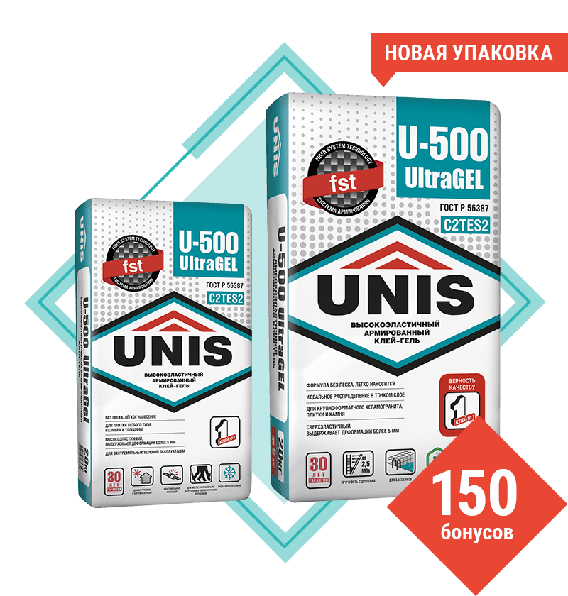 | U-500 SuperFlex клей плиточный, 20 кг, 15 кг | U-500 UltraGEL высокоэластичный армированный гелевый клей, 20 кг | 150 |