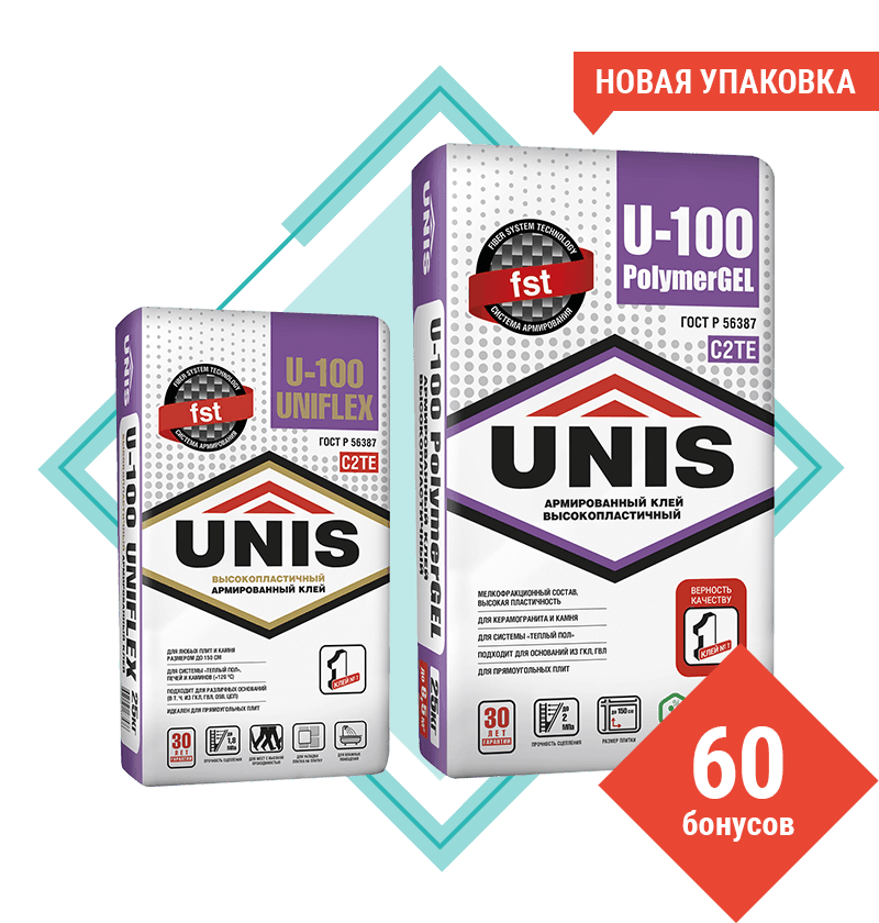 | UNIFLEX U-100 клей эластичный, 25 кг | U-100 высокопластичный армированный клей, 25 кг | 60 |